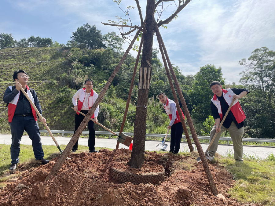 啟動儀式結束后,參會人員來到義務植樹造林活動現場,與當地鄉賢、黨員、志愿者一起鍬鏟土、填坑夯苗、提水澆灌,合力栽下572棵樹苗。